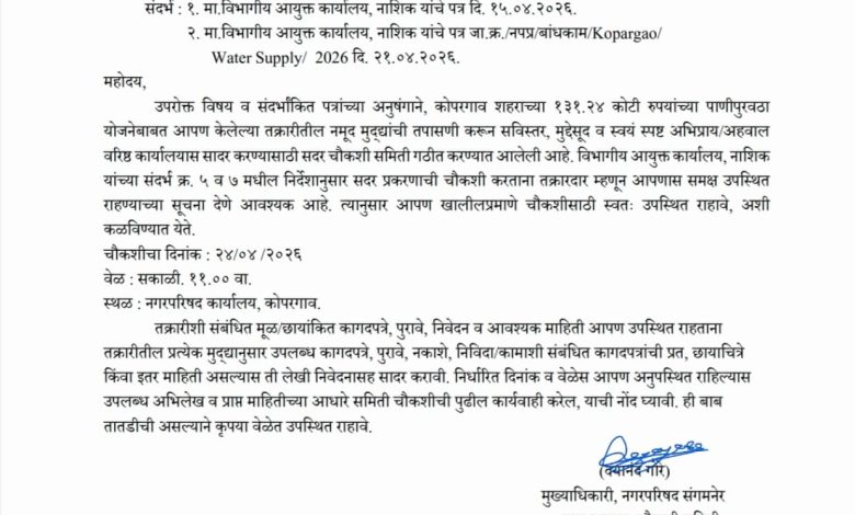 कोपरगांव शहराच्या १३१.२४ कोटींच्या पाणी योजनेची शासकिय चौकशी सुरु होणार … राजेश मंटाला 🙏नमस्कार 🙏…